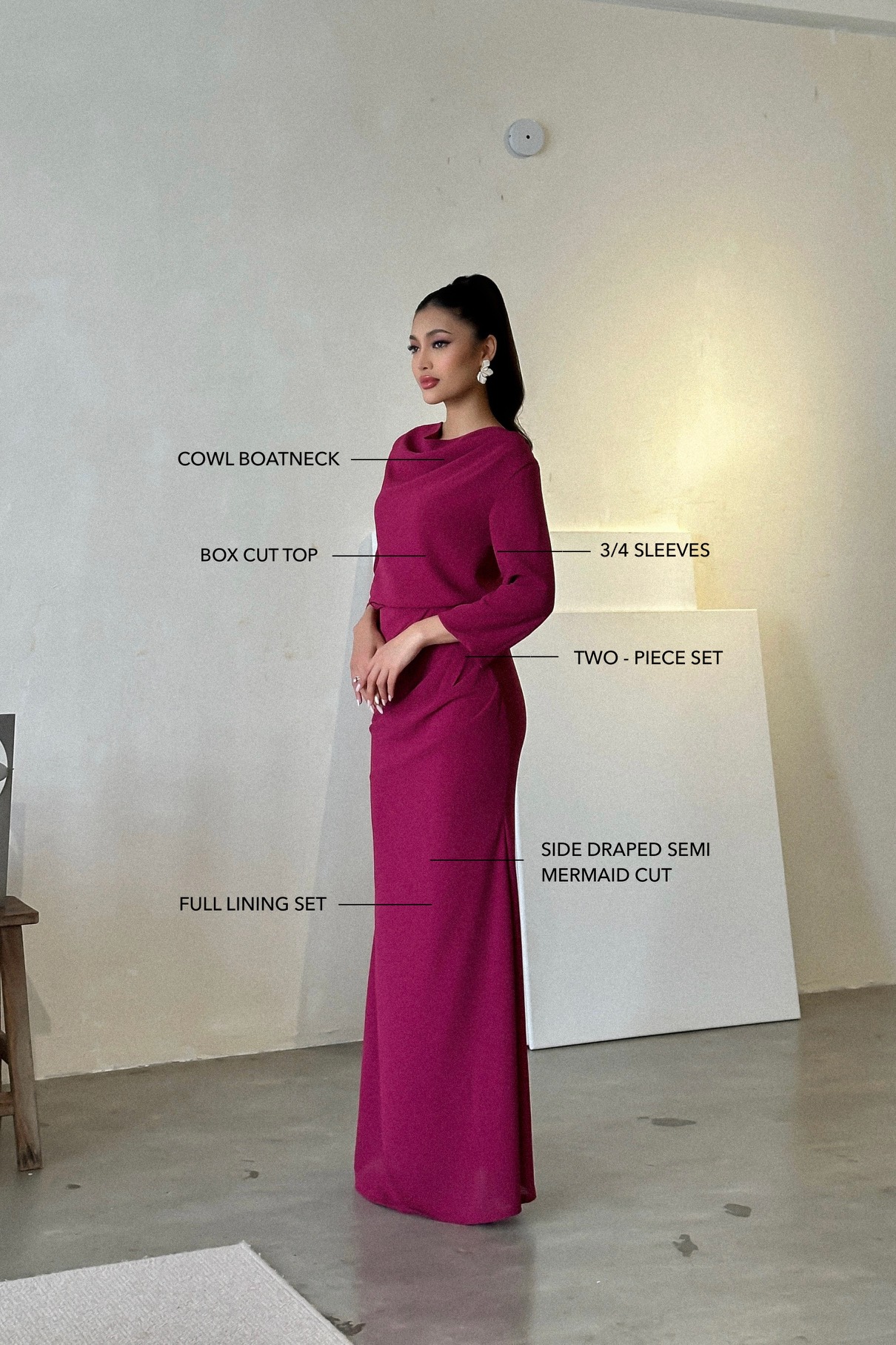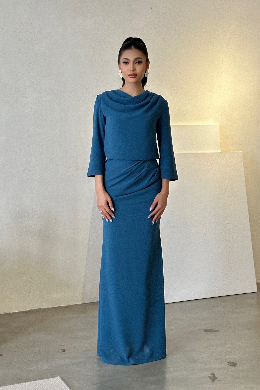 RIMA set is all about ease, elegance and minimalism. Cut for a boxy-slim silhouette, this RIMA set is made from breathable premium heavy chiffon and jersey lining falls to a floor-sweeping maxi hem that feels equally effortless and elegant. It has box cut top and side-draped semi mermaid cut.